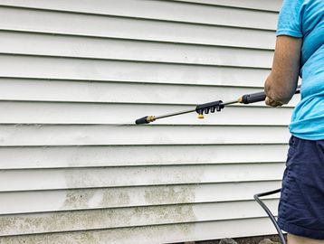 Soft washing of home siding, soffits, fascia and trim of house to remove organic growth.
