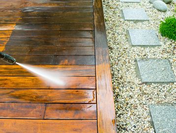 Soft washing of deck to remove organic growth.